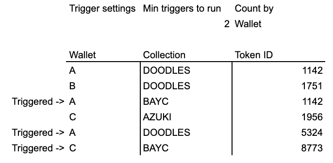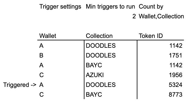 Our Token Bought trigger has the following settings: Min triggers to run: 2 Count by: Wallet,Collection