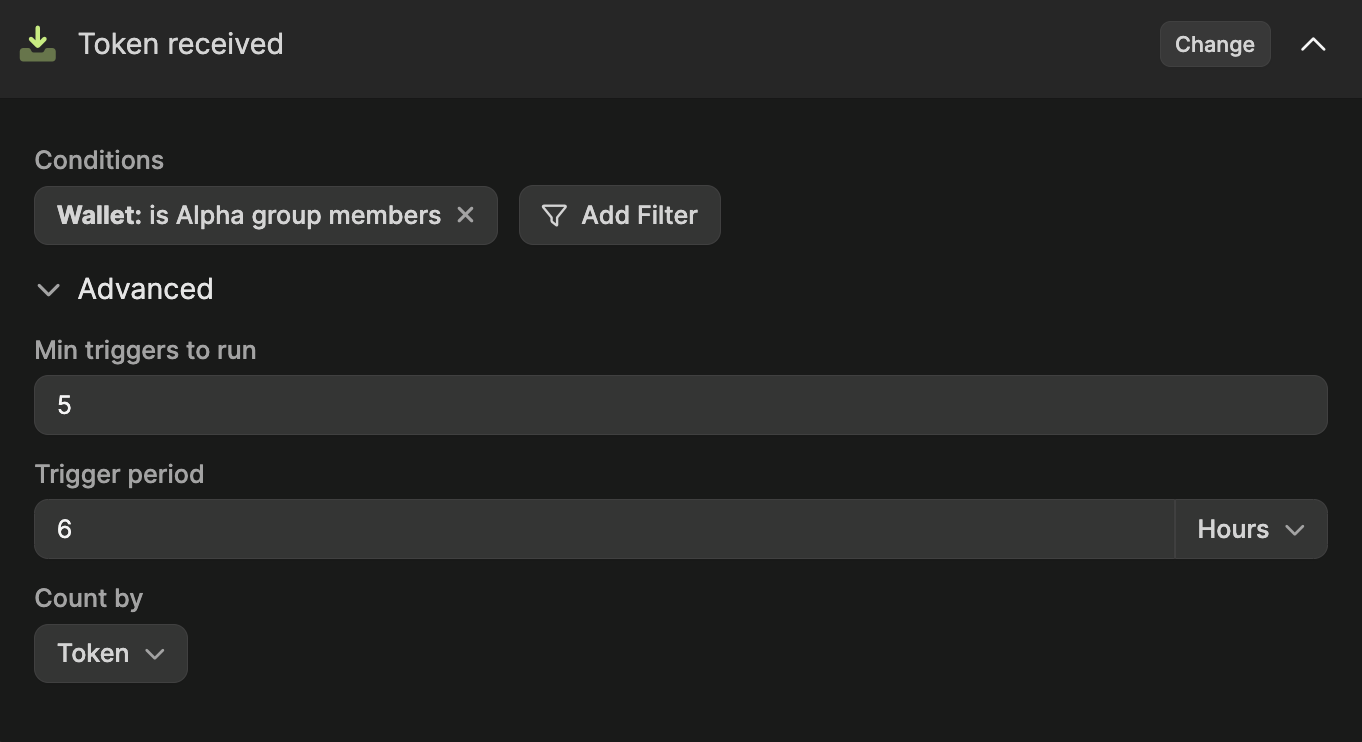 Our Token Bought trigger has the following settings: Min triggers to run: 2 Count by: Wallet